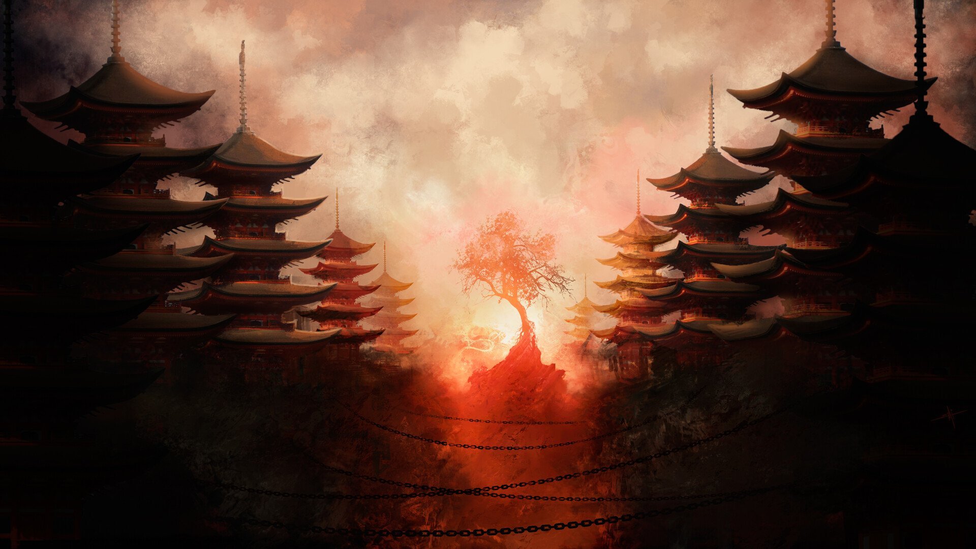 ![Японская живопись пагода]()