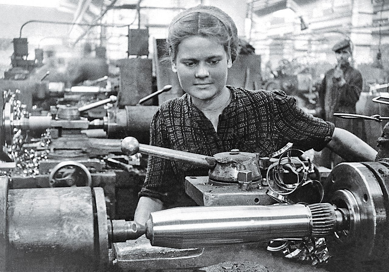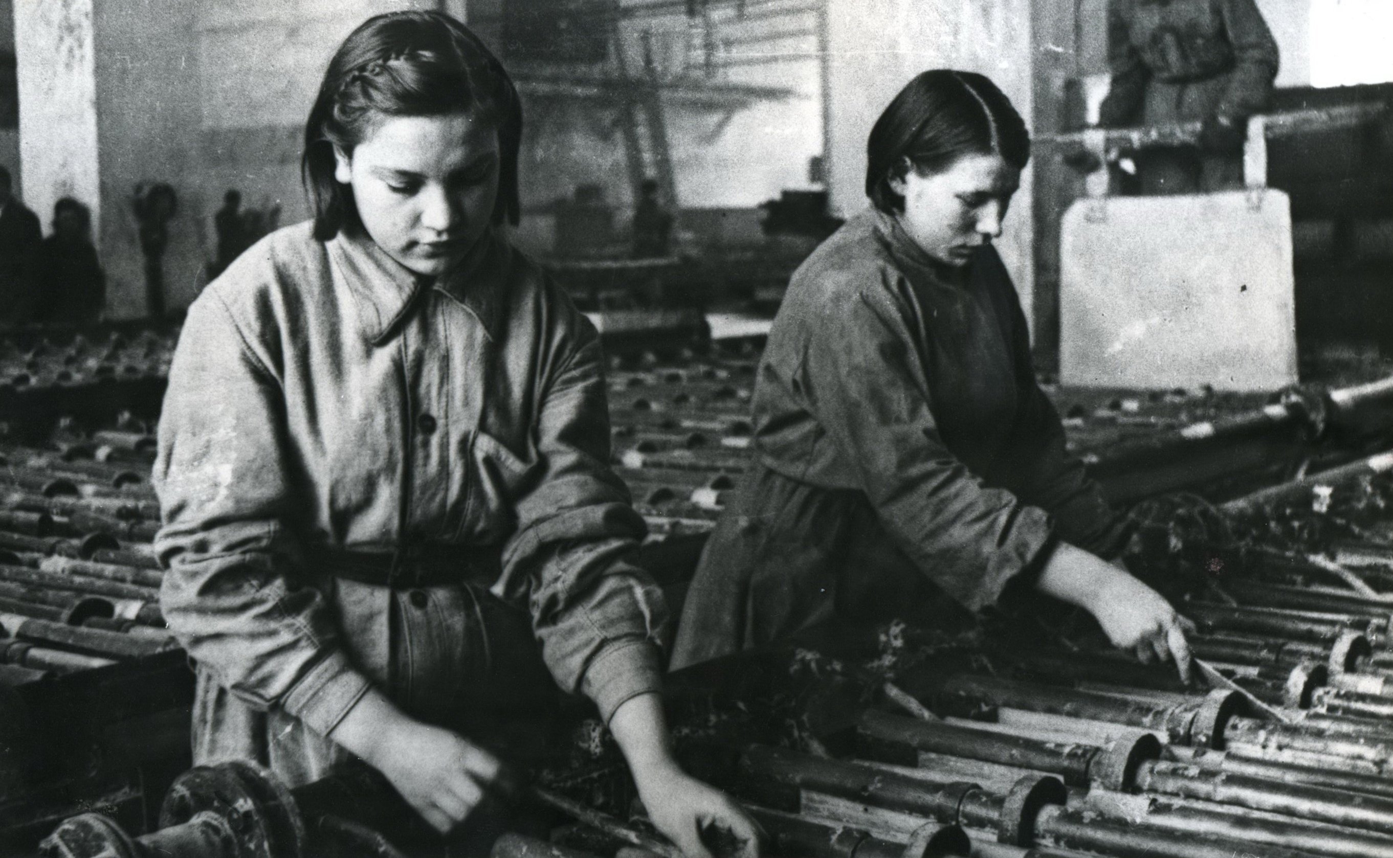 ![Женщины и дети работают на военном заводе]()