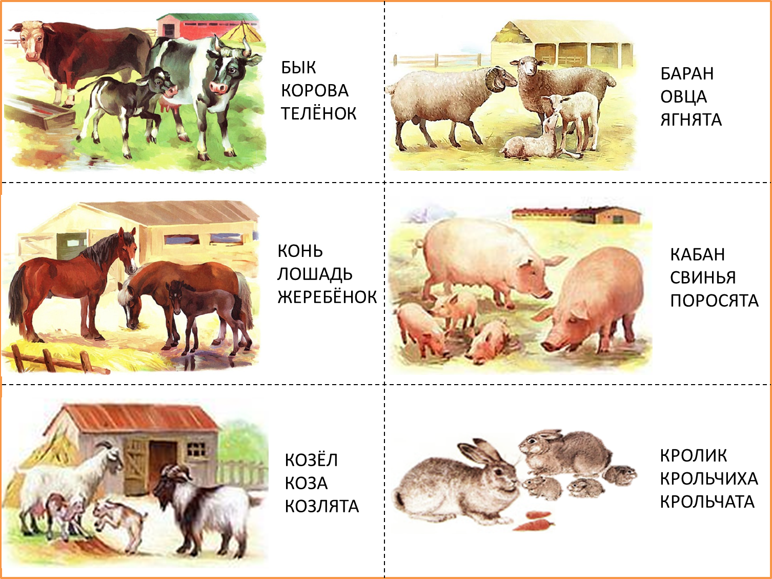 Карточки с домашними животными и их детенышами