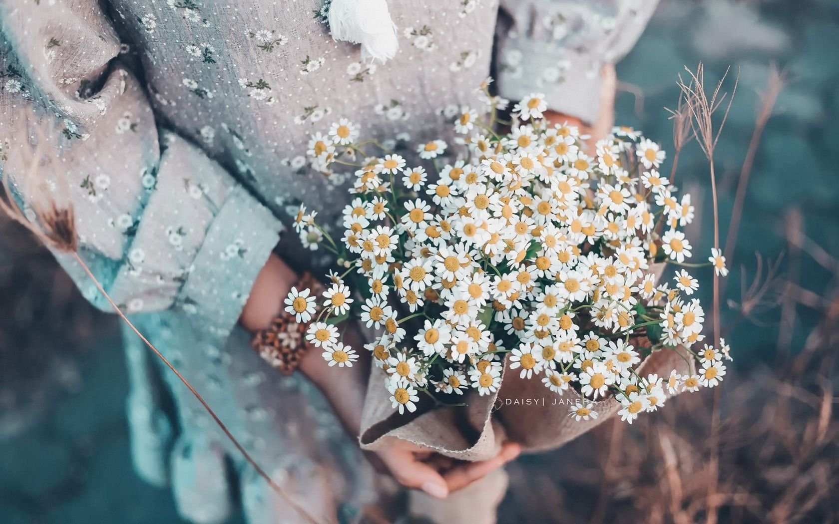 ![Букет ромашек в руках]()