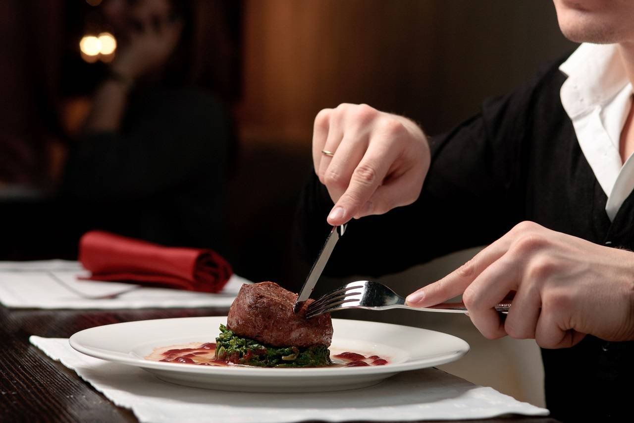 Ест вилкой и ножом