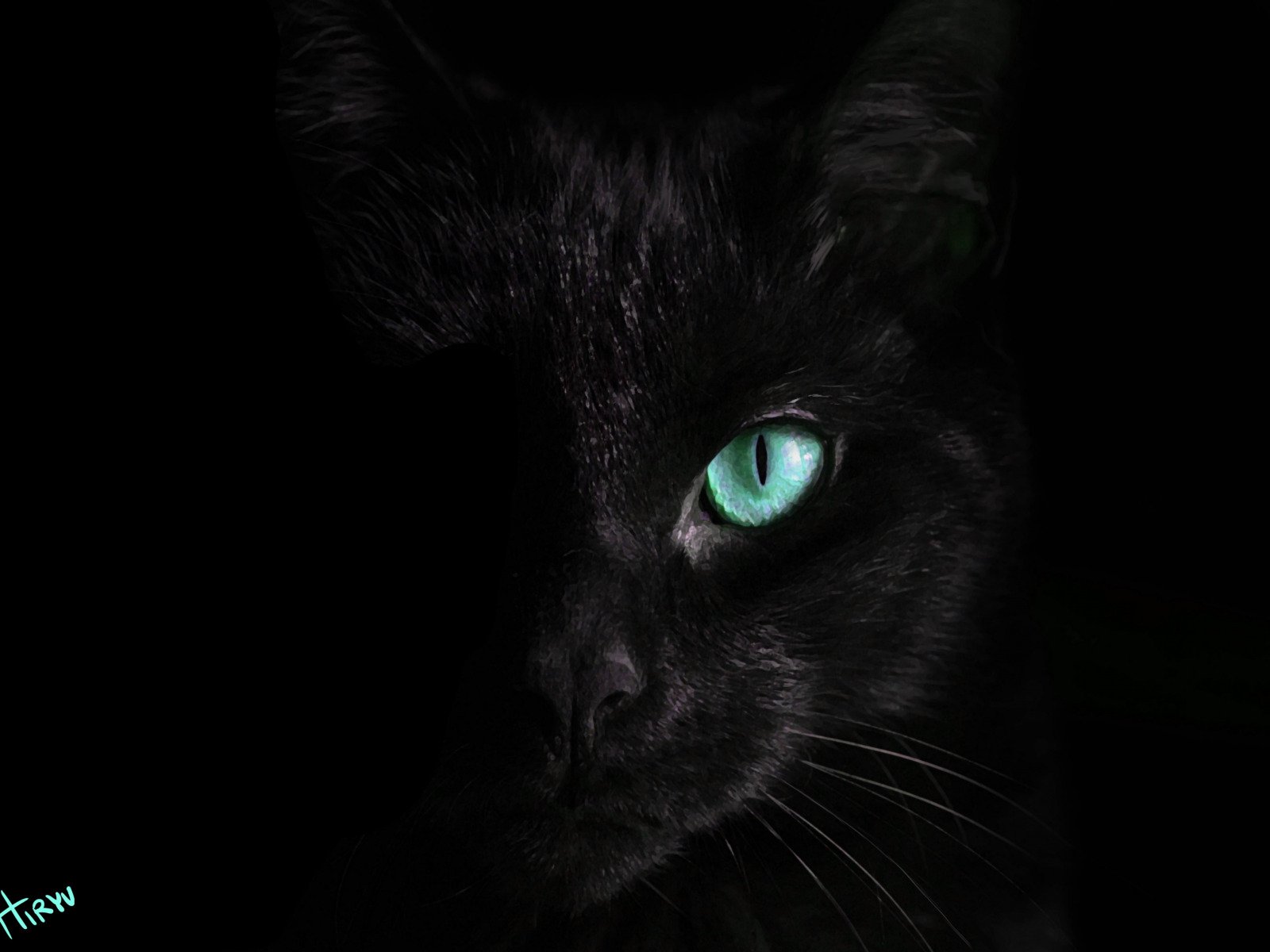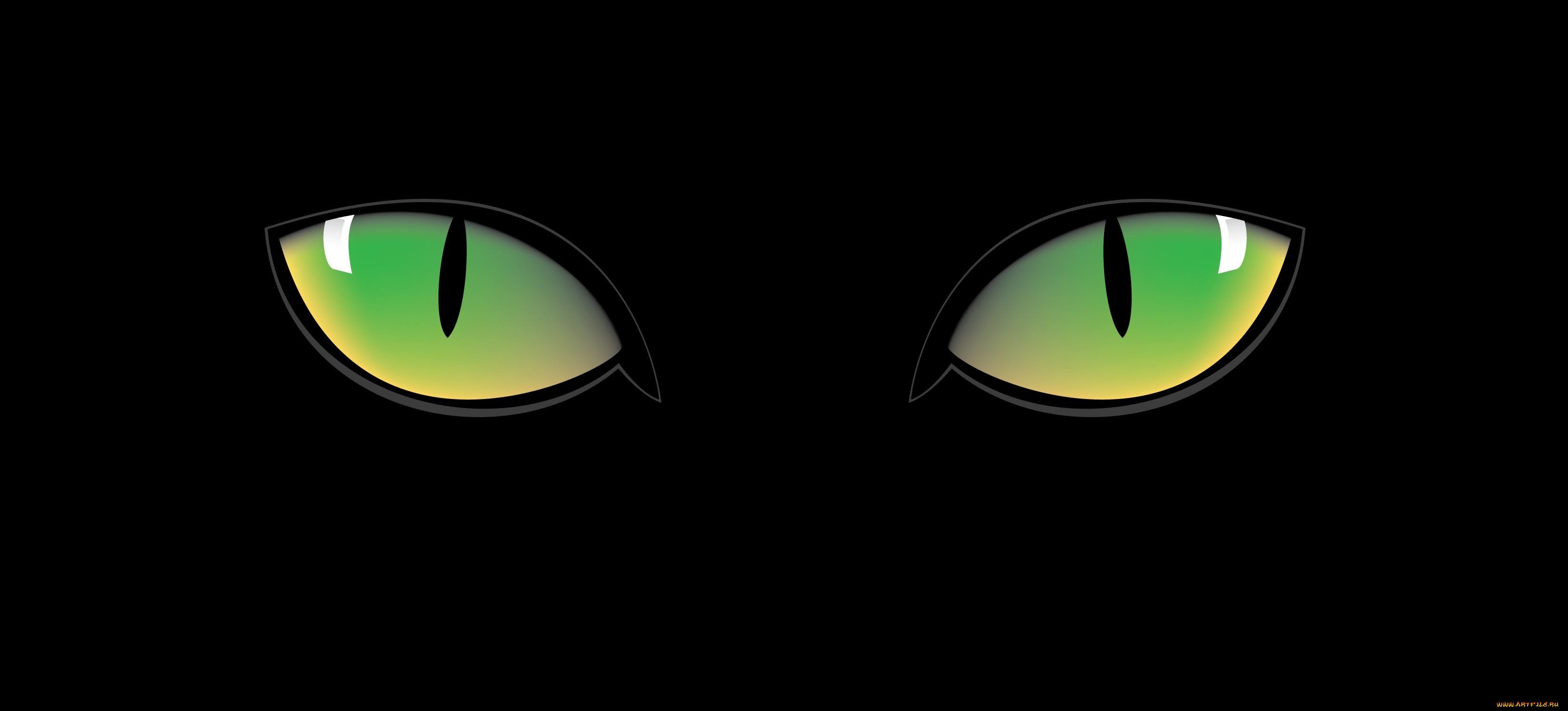 ![Зеленые кошачьи глаза на черном фоне]()
