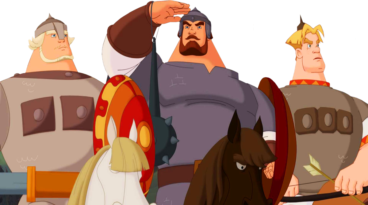 ![Три богатыря из мультика на белом фоне]()