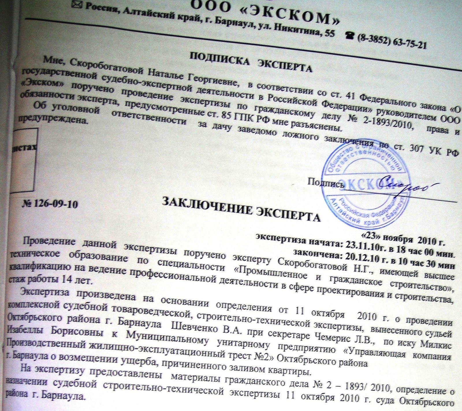 Заключение судебной экспертизы