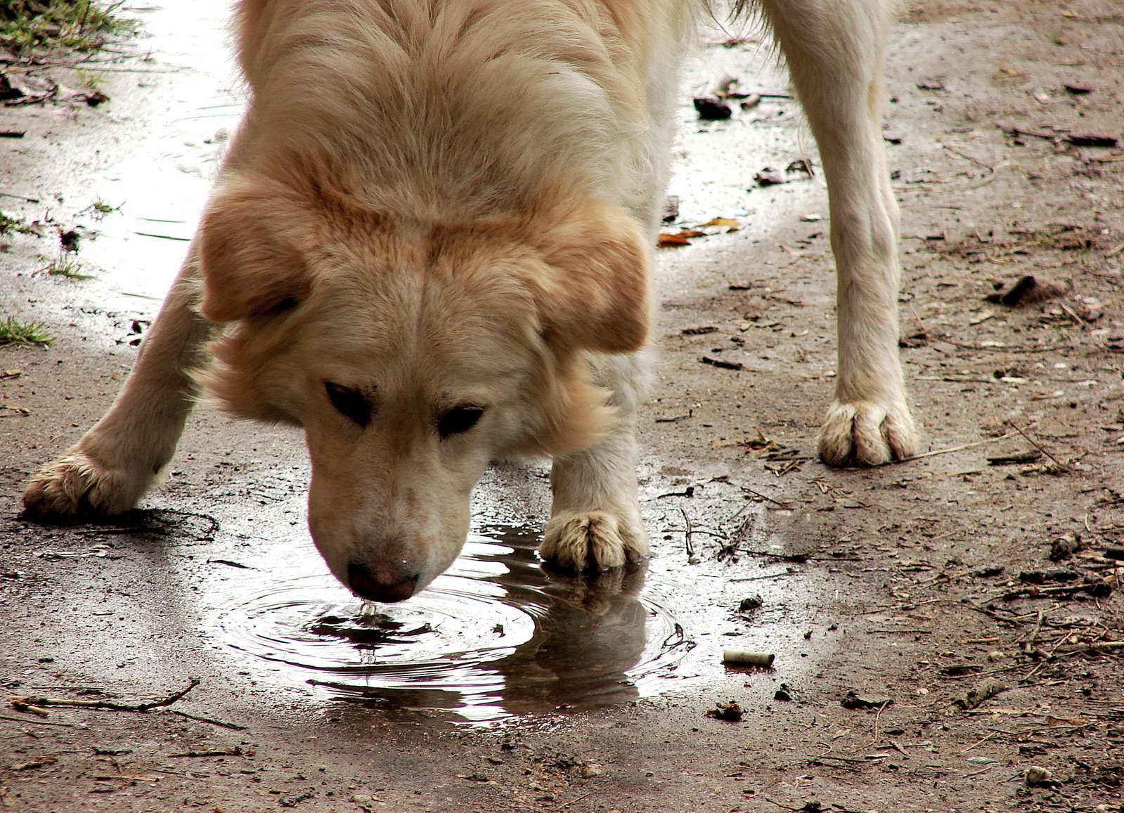 ![Собака пьет из лужи]()