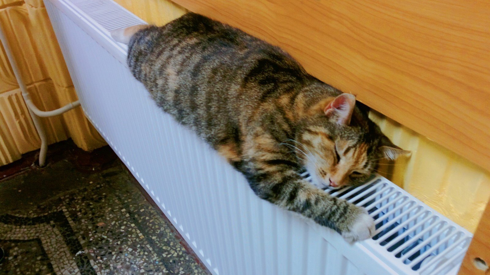 ![Кот лежит на батарее]()
