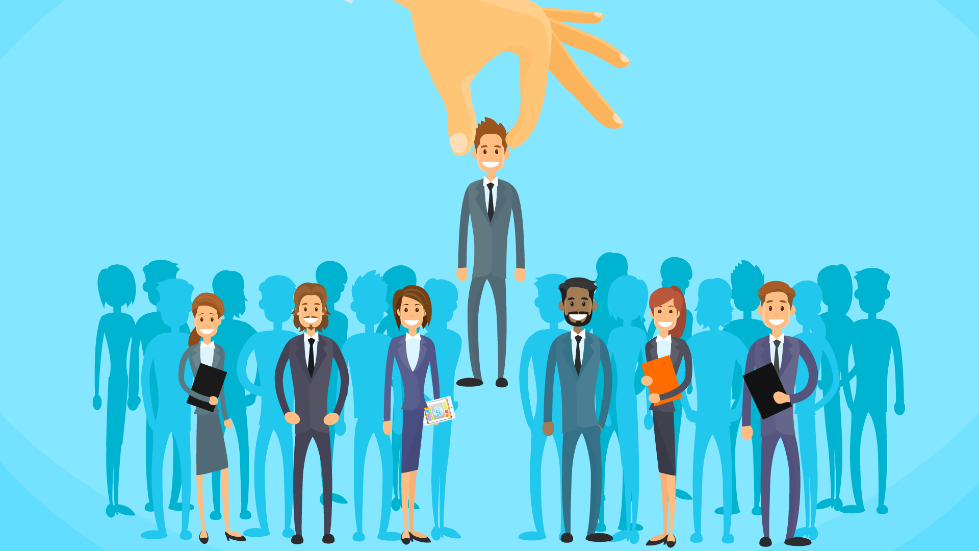 Команда людей на голубом фоне