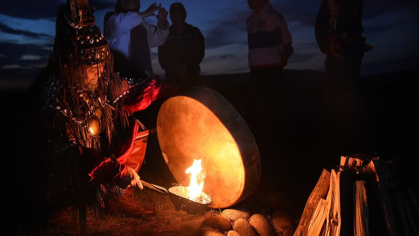 ![Шаман с бубном у костра]()