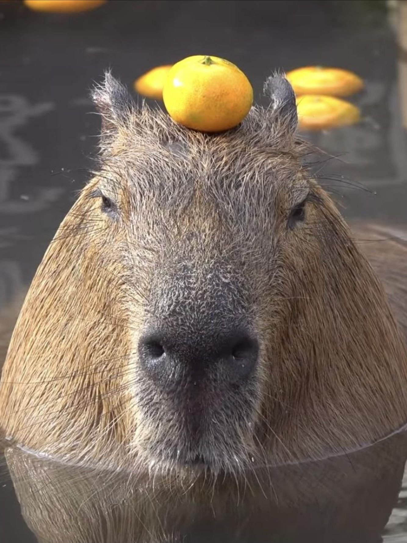 Капибара с апельсином на голове