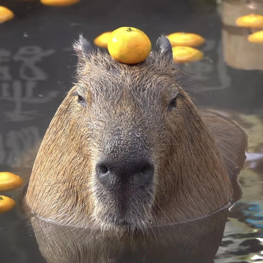 ![Капибара с апельсином на голове]()