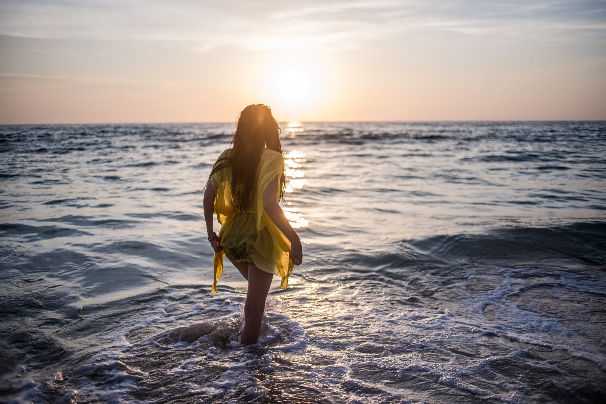Девушка на берегу моря на закате