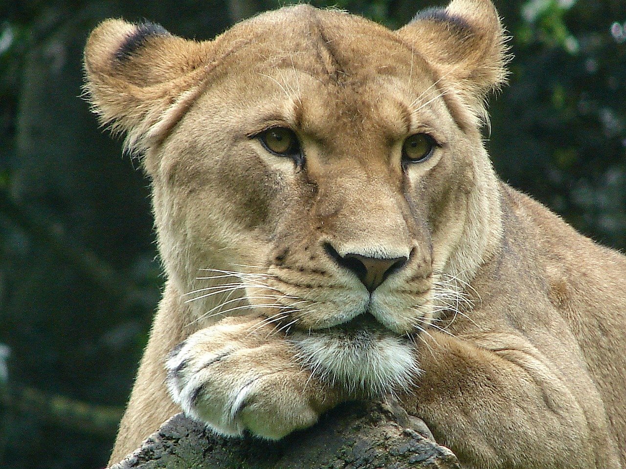 Львица прикрывает лапой один глаз