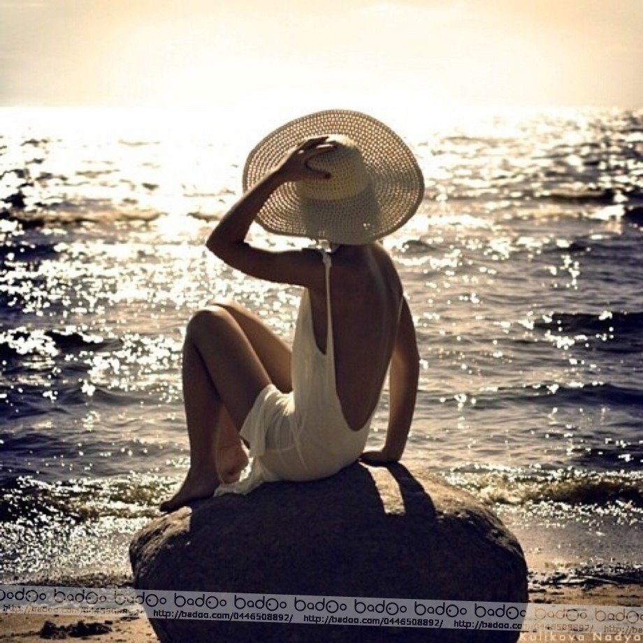 ![Дама в шляпе на море]()