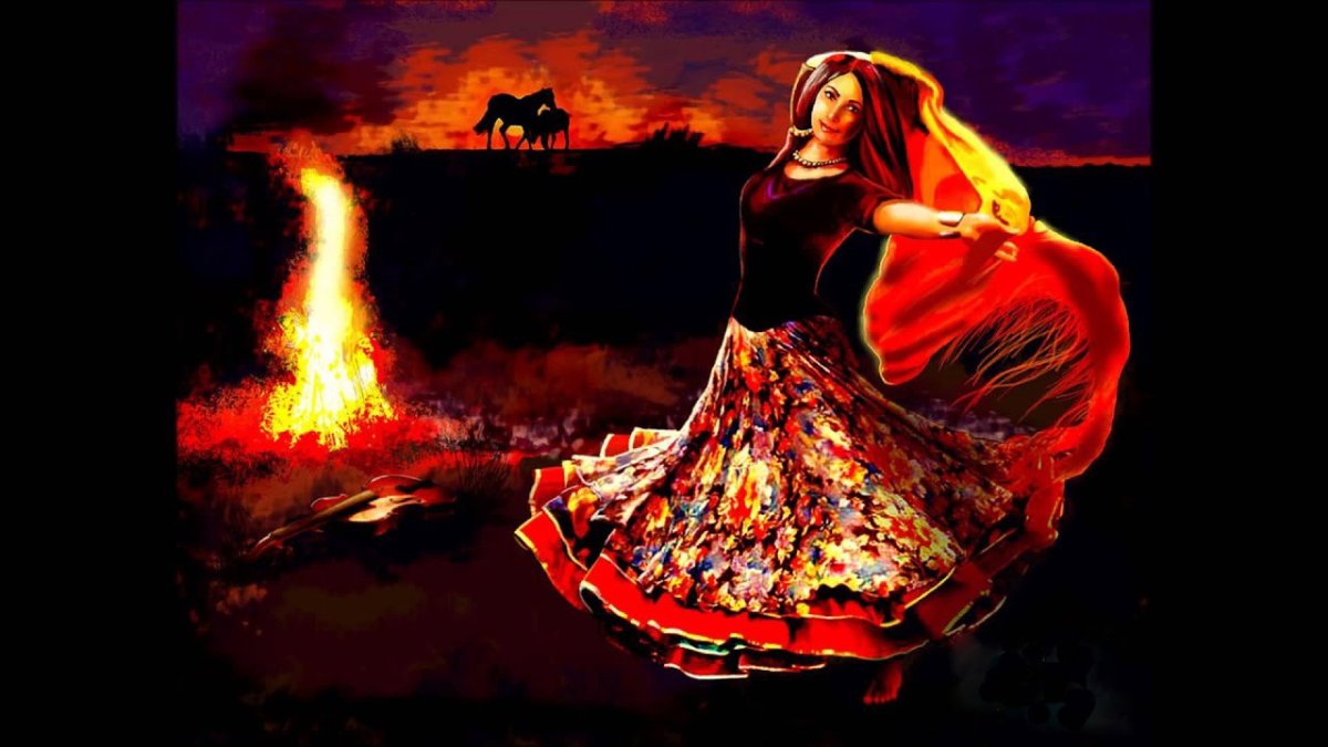 ![Цыганка танцует у костра]()
